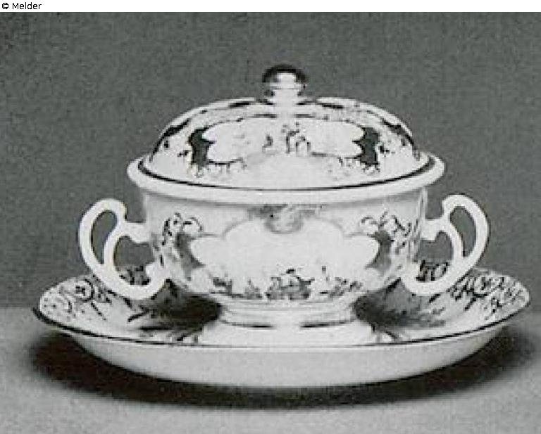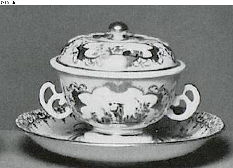 Each with two handles and nodular knobs. At every cup two and on every cover three cartouches in golden lace with Chinese motifs inside. At saucer in various colours branches in bloom and some architecture in Chinese style. One handle luted. Without marks. Number of gold painter 1. Meissen, around 1725–1730. Literature: Auktionskatalog Hans W. Lange, Wertvolles Kunstgewerbe, Berlin, 19.-21. Mai 1941, S. 102. Nr. 480, Taf. 69 (DOI: external link)