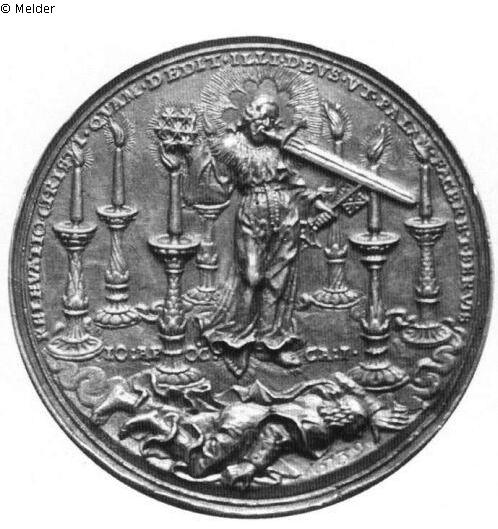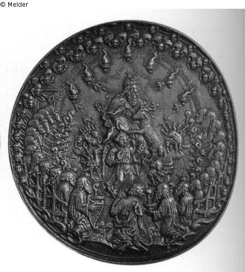 Medaille. Vs.: Christus steht zwischen den sieben Leuchtern. In den Händen hält er sieben Sterne und zwei Schlüssel. Von seinem Munde geht ein Schwert aus. Zu seinen Füßen liegt Johannes auf dem Angesicht. Umschrift: RELEVATIO CHRISTI QUAM DEDIT ILLI DEUS VT PALAM FACERET SERVIS. Inschrift im Feld: IO : AP OC CA : I Unten rechts die vertiefte Jahreszahl 1539. Rs.: In der Mitte sitzt Gottvater mit dem Buch und dem Lamm auf dem Schoß, umgeben von den Symbolen der vier Evangelisten. Über ihm schweben sieben Lampen, und vor ihm steht ein Engel mit erhobenen Händen. Ringsum sitzen die 24 Ältesten, die Harfen und Kelche in den Händen halten, und in der Mitte zwischen ihnen kniet Johannes. Ganz außen sieht man einen Kranz von Cherubsköpfen. Unten die vertiefte Inschrift IDEM CA IIII, darüber die Signatur HR (ligiert). Es existiert auch eine spätere, 1547 datierte Fassung, z. B. auf der Auktion Löbbecke 1925.