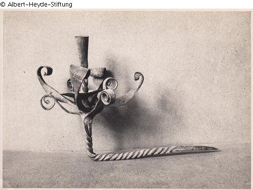 Sconce with nail-shaped top. Twisted and angled shaft, forged into a spout at the upper end. Below the drip pan four larger and smaller leaf decorations rolled inwards and outwards respectively.