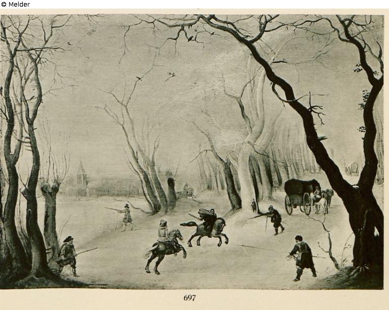 Böhler: 697 Dutch Master of the 17th Century. Winter landscape with assault on a wagon standing at the beginning of a path leading to the right into the depth. In the background a second wagon. On the left on the far bank of a river a church tower. In the foreground two horsemen and three men on foot with lances and rifles attacking each other. In the middle ground some smaller figures. The monogram HA on the tree to the right. - Oak wood, height 32 cm, width 43.5 cm. Panel 68