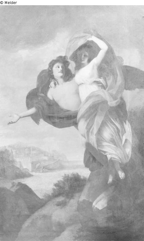 Zephyrus [Zephyr] and Psyche hovering over landscape