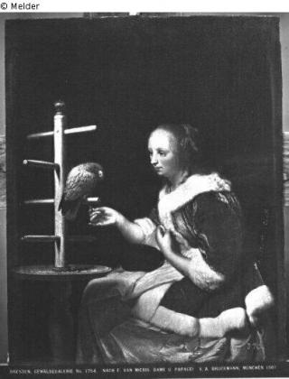 Search Request A lady feeding her parrot Artist / Creator Mieris, Frans van (der Ältere) (Kopie nach) Object type Painting Material / TechniqueOil ; Panel (Oak) / paintedLost Art-ID129864