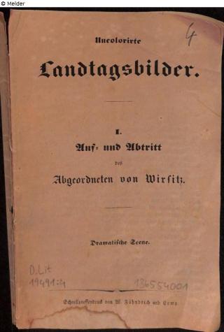 Found-Object Report Uncolorirte Landtagsbilder 1 Auf- und Abtritt des Abgeordneten von Wirsitz: dramatische Scene Author unbekannt Publisher Fähndrich Object type Book Lost Art-ID631952
