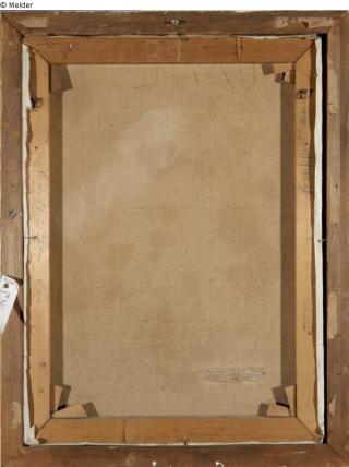 Zierrahmen: o.l. in schwarz: "D. R."; o.l. in rot: "9."; o.M. in schwarz: "18". Keilrahmen: o.l. kleiner roter Stempel, nicht lesbar; o.M. in rot: "1601; o.r. Stempel der Rahmenfirma; o.r. in blau: "frankfurt main"; o.l. in rot: "8"; l.M. in blau: "679/332"; u.r. Stempel der Rahmenfirma; u.l. schwarzer Zollstempel, nicht lesbar; u.l. in Blei: "1601"; u.M. Stempel der Rahmenfirma. Leinwand: verso: o.M. weiße Kreide, verwischt
