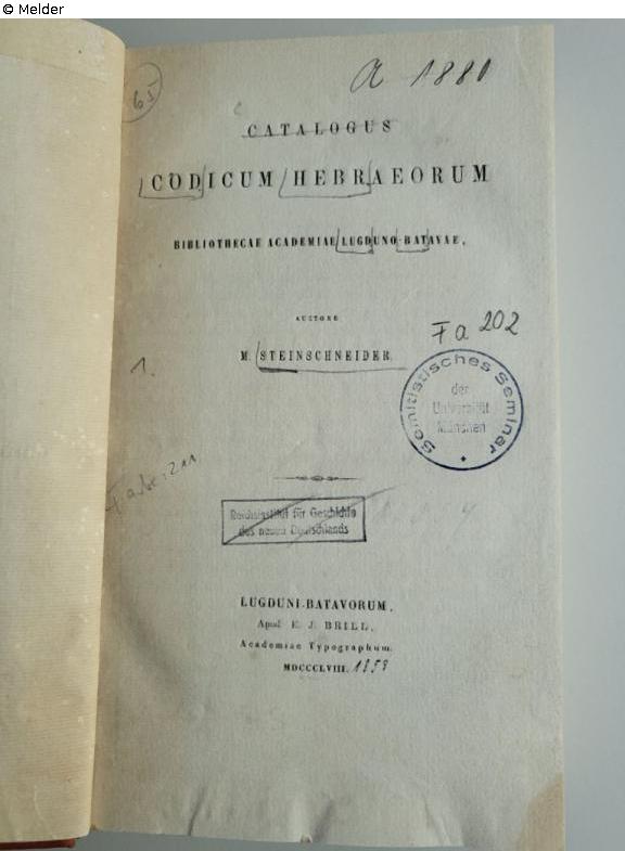 Fundmeldung | Einzelobjekt Catalogus Codicum Hebraeorum Bibliothecae Academiae Lugduno-Batavae Lost Art-ID632692 Vorherige Weiter Autor:in Steinschneider, M. Verlag Brill TitelCatalogus Codicum Hebraeorum Bibliothecae Academiae Lugduno-BatavaeErscheinungsortLugduni Erscheinungsdatum1858ObjektartBuchObjektgruppeBibliotheksgutSignatur1207/Fa 202Beschreibung Stempel "Reichsinstitut für Geschichte des neuen Deutschlands" (A1880/10359 ). Weiterlesen Weniger anzeigen Veröffentlicht seit28.10.2025 Kontakt Ludwig-Maximilians-Universität Institut für den Nahen und Mittleren Osten Bibliothek Veterinärstr. 1 80539 München Deutschland Tel0049-89-2180-3039Homepagehttps://www.naher-osten.uni-muenchen.de/institut/bibliothek/index.html Ansprechpartner:in Prof. Dr. Ronny VollandtPositionProfessor für JudaistikE-Mailronny.vollandt@lmu.de