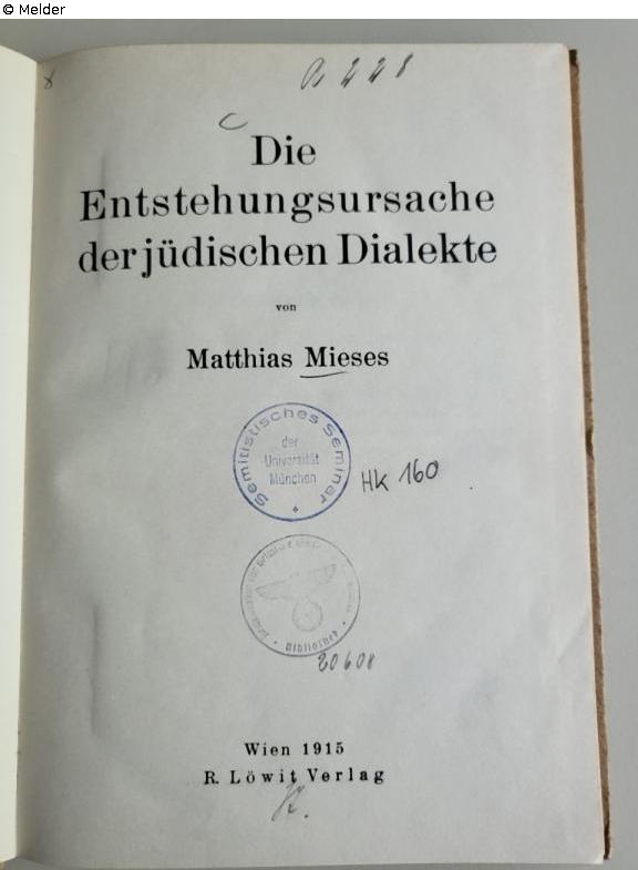 Fundmeldung | Einzelobjekt Die Entstehungsursache der jüdischen Dialekte Lost Art-ID632681 Vorherige Weiter Autor:in Mieses, M. Verlag Löwit TitelDie Entstehungsursache der jüdischen DialekteErscheinungsortWien Erscheinungsdatum1915ObjektartBuchObjektgruppeBibliotheksgutSignatur1207/Hk 160Beschreibung Stempel „Reichsinstitut für Geschichte des neuen Deutschlands“ (A448/20608 ). Weiterlesen Weniger anzeigen Veröffentlicht seit28.10.2025 Kontakt Ludwig-Maximilians-Universität Institut für den Nahen und Mittleren Osten Bibliothek Veterinärstr. 1 80539 München Deutschland Tel0049-89-2180-3039Homepagehttps://www.naher-osten.uni-muenchen.de/institut/bibliothek/index.html Ansprechpartner:in Prof. Dr. Ronny VollandtPositionProfessor für JudaistikE-Mailronny.vollandt@lmu.de