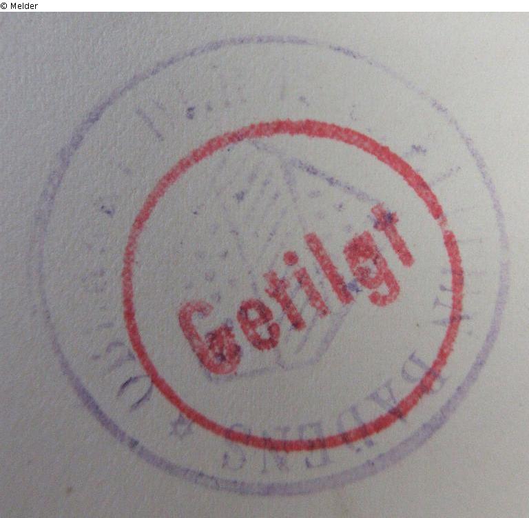 Bibliotheksgut; Runder Stempel mit der Schrift "Oberrat der Israeliten Badens" und dem badischen Staatswappen in der Mitte. Dieser Stempel wurde mit einem roten runden "Getilgt"-Stempel überstempelt.