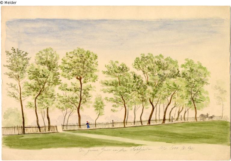 Im Vordergrund ist eine grüne Wiese vor einem Lattenzaun abgebildet. Im Hintergrund stehen grüne Bäume die direkt an den Zaun angrenzen. Auf einem Weg am Zaun laufen Passanten. Eine davon trägt ein blaues Gewand und eine rote Kopfbedeckung. Rechts auf dem Weg befindet sich ein Kutscher mit einem Gespann. bez. u. m. (Bleistift): Die grüne Gasse in den Kohlgärten. 15/5. 1888 GD. Lpzg.
