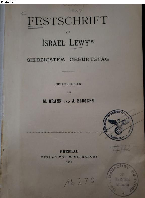Fundmeldung | Einzelobjekt Festschrift zu Isareal Lewy`s siebzigstem Geburtstag Lost Art-ID634272 Vorherige Weiter Herausgeber Brann, M./Elbogen, J. Verlag Marcus TitelFestschrift zu Isareal Lewy`s siebzigstem GeburtstagErscheinungsortBreslau Erscheinungsdatum1911ObjektartBuchObjektgruppeBibliotheksgutSignatur1207/Hd 133Beschreibung Stempel "Reichsinstitut für Geschichte des neuen Deutschlands" (A2696/17192) Weiterlesen Weniger anzeigen Veröffentlicht seit02.02.2026 Kontakt Ludwig-Maximilians-Universität Institut für den Nahen und Mittleren Osten Bibliothek Veterinärstr. 1 80539 München Deutschland Tel0049-89-2180-3039Homepagehttps://www.naher-osten.uni-muenchen.de/institut/bibliothek/index.html Ansprechpartner:in Prof. Dr. Ronny VollandtPositionProfessor für JudaistikE-Mailronny.vollandt@lmu.de