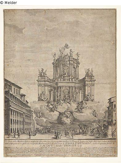 Festarchitektur mit Feuerwerk in Form eines in den Wolken schwebenden Sakralbaus mit Tambour, 1728 vom Architekten Nicola Salvi geschaffen. Über der Barcaccia erbaut, sind in den Wolken Hymeneo (Gott der Hochzeitszeremonien), Amor auf der Weltkugel und oben Apollon, umgeben von den neun Musen, zu sehen.
