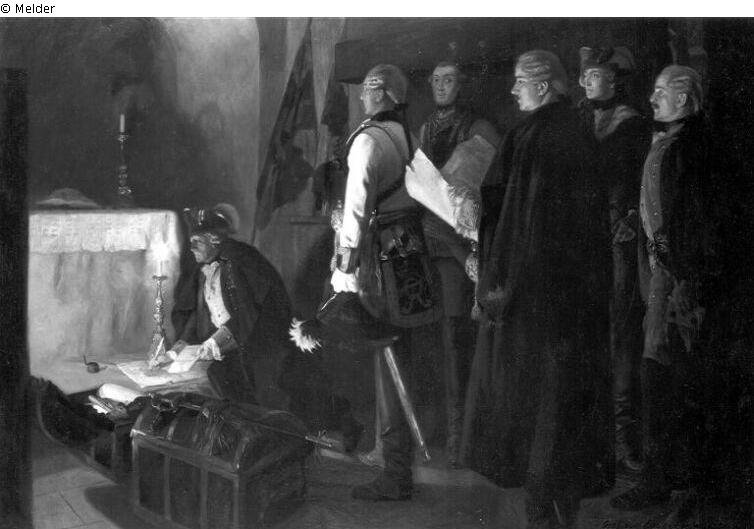 In einem Innenraum Friedrich den Großen mit Mantel und Dreispitz in Gesellschaft seiner Generäle. Am linken Bildrand befindet sich ein Kamin, davor der kniende König bei Kerzenschein schreibend. Im rechten Bildteil sind fünf Generäle in stehender Haltung und mit Blick zu Friedrich den Großen dargestellt. Der Mittlere trägt einen bodenlangen, dunklen Mantel.