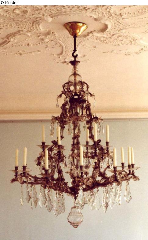Französische Louis XV-Kristallkrone, achzehnkerzig und lyraförmig. Die Krone ist mit einem reichen Behang an blattförmigen Klunkern versehen. Einige Bestandteile sind nicht original und wurden ergänzt.