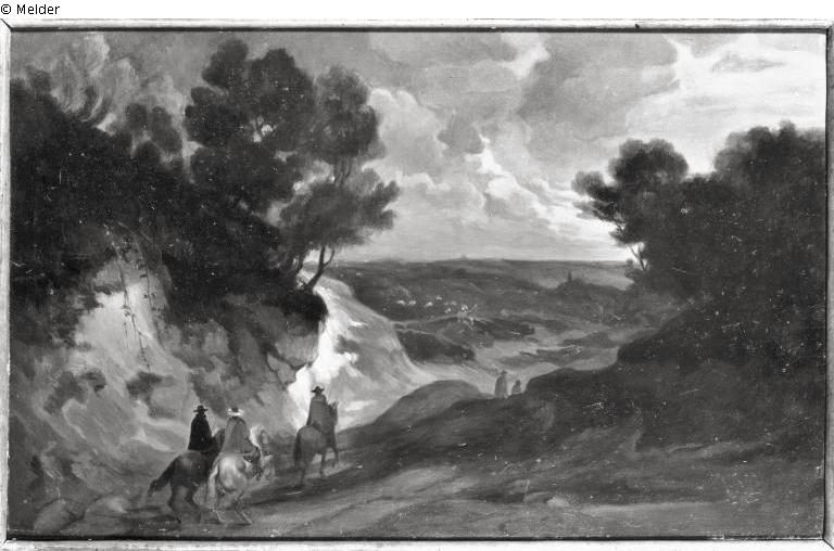 Rückseite weiß gestrichen, oben links viereckiger Stempel direkt aufs Holz "24. Nov. 1938", darunter in Rot "700,-", oben rechts in Blau "XR 20/300", daneben in Blau "12572" (Münchner Nummer), unten links Aufkleber BStGS "Inv.Nr. 12155, Kopie nach de Vadder, 1938, Landschaft mit 3 Reitern, durchgestrichen: Deutsch um 1860", rechts daneben weiterer Aufkleber BStGS "Inv.Nr. 12155, Copie nach de Vadder, Landschaft mit Reitern, durchgestrichen: Deutsch um 1820", unter den Aufklebern in Blau "PR" (Photo Roth)