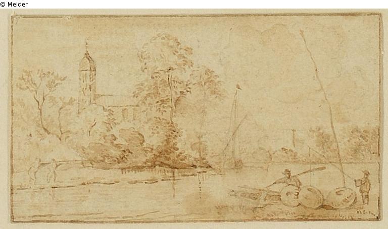 Landschaft mit Kirche am Fluss und Boote