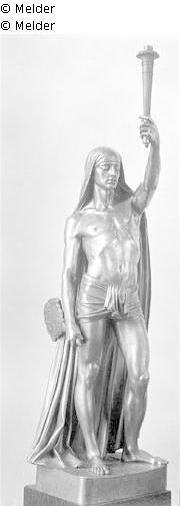 Am Sockel: A. Toussaint 1850; Mann mit einem Lendenschurz, in der Linken die Fackel, in der Rechten einen pfauenartigen Fächer. Über dem Kopf nach unten bis zu den Füßen ein Tuch.