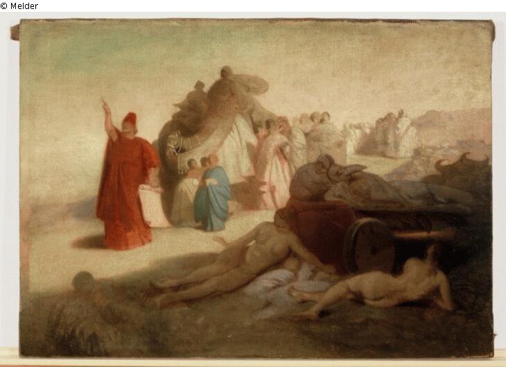 Mose mit seinem Volk und Tieren in der Wüste (Moses, people, animal, desert, religion); auf dem Keilrahmen aufgemalte Bezeichnungen (on stretcher paint markings): "Michael Lieb 1868", "C6"; weiterhin drei Wachs-Siegel von J.F.H. Colloredo-Mannsfeld (three wax seals of J.F.H. Colloredo-Mannsfeld); auf dem Rahmen in roter Farbe die Bezeichnung (on frame red paint marking): "13"
