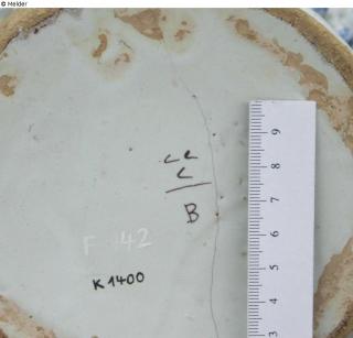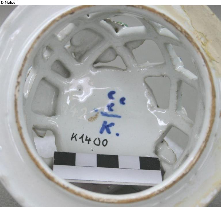 Netzvase mit plastischen blau-gelben Blumen auf den Kreuzungspunkten; auf Hals und Fuß Blumenornamente in den Farben Gelb, Grün, Manganviolett und Blau. Marken: „CCC/B“ und „CCC/K.“ der Fayence-Manufaktur Hannoversch-Münden, welche sich auf die drei Halbmonde im Stammwappen der Familie von Hanstein beziehen.