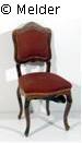 Geschweiftes Gestell, Sitz und Rückenlehne mit Fassonpolster, Bezug ergänzt. Beine geschweift mit Schnitzerei, Messingbeschläge, gepolsterte Sitzfläche und Rückenlehne mit roter gemusterter Bespannung, Rückenlehne umrahmt von Metallstreifen in Form einer Kordel.