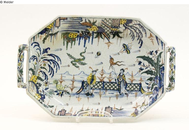 Fayence, Scherben rot, grauweiß glasiert, Scharffeuermalerei in zweierlei Blau, Mattrot, Gelb, Dunkelgrün, etwas Schwarz. Konturen Blauschwarz; Sechseckige flache Schale auf Standring, mit ausschwingender Wandung, Stabgriffe an den Schmalseiten. Chinoiserie: auf einer angedeuteten Terrasse zwei prächtig gekleidete Figuren, einer mit einer Fahne. Im Hintergrund verschwimmende Berge. Chilin, in der Luft fliegender Drache und Insekten