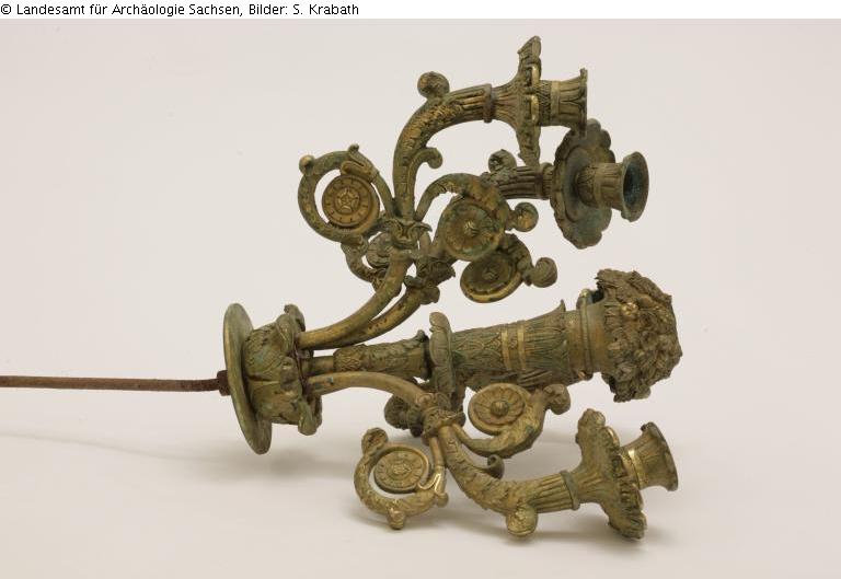 2 Stück; Die beiden gußgleichen Leuchter besitzen einen kannelierten Schaft, der auf einem dreifüßigen Sockel ruht. Dieser wird oben durch eine vierarmige Krone abgeschlossen, die ursprünglich Leuchtköper aufnehmen konnte. Die Einzelteile mit Blattwerkdekor sind z.T. verbogen und gebrochen