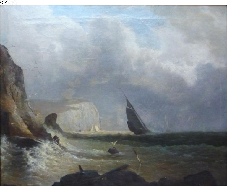 Von links bis knapp zur Bildmitte dunkle graubraune, zum Horizont hellgrauer werdende Felsen, im Vordergrund von weißen Schaumspritzern umspült. Auf dunkelgrünem Meer ein dunkelgraues schiefliegendes Segelboot vor blaugrau bewölktem Himmel mit lichtblauem Ausschnitt.