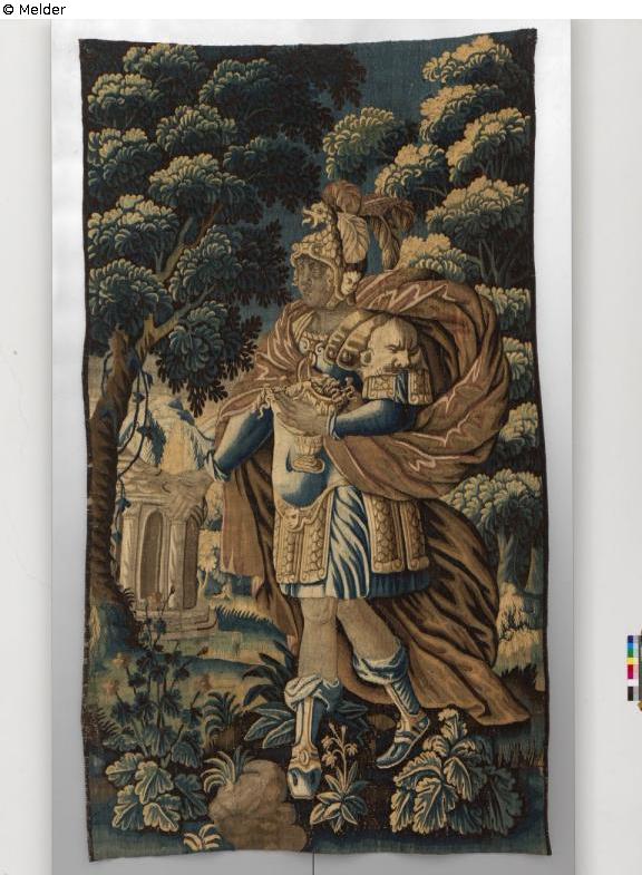 Vrmtl. Werkstatt in Flandern. Auf dem Teppich dargestellt ist ein männlicher Heros gekleidet in einem kurzen Chiton mit Rüstungsartigen Aufsätzen und einem Helm der in einem Drachenkopf mündet. Der Mantel ist aufgeplustert und in seiner Linken trägt er einen Pokal. Er steht in einer Waldlandschaft in der im Hintergrund ein Rundtempel zu sehen ist.