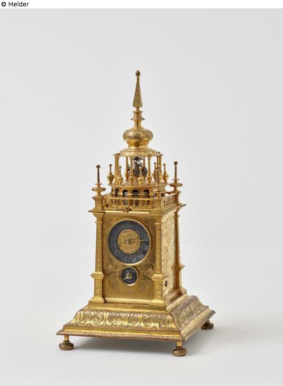 Auf abgeflachten Kugelfüßchen quadratischer Sockel mit gravierten Ranken, Blättern und Blüten, der sich leicht geschwungen verjüngt. Darauf der quadratische Uhrturm, an den Ecken von Pilastern auf Sockeln gefaßt. Auf der Vorderseite des Turmes rundes Zifferblatt in Silber, darunter kleine runde Vertiefung mit Stift zum Aufziehen der Uhr. Auf der Rückseite des Turmes rundes Zifferblatt und Perpendikel. Alle vier Seiten des Uhrturmes mit graviertem Ornament bedeckt. Eine durchbrochene Brüstung bekrönt den Turm. Darauf in der Mitte runder Aufsatz, der unten die Glocke umschließt, darin von 7 Säulchen getragener Pavillon mit geschweifter Haube. Zwischen den Säulen 8 kleine Vasen. In der Mitte des Pavillons Vase mit Blumen (Silber); Unterseite Aufkleber mit Inventarnummer des Museums