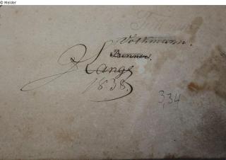 Autogramm: "[G] Lang 1838" (durchgestrichen); Autogramm: "Benner" (durchgestrichen), Autogramm: "Volkmann" (durchgestrichen); Autogramm: "Fellbaum"; Rundstempel: "Musikwissenschaftliches Institut der Universität Köln"; Stempel: "Inventar-Nr."; dahinter handschriftlich ergänzt: "8,328";