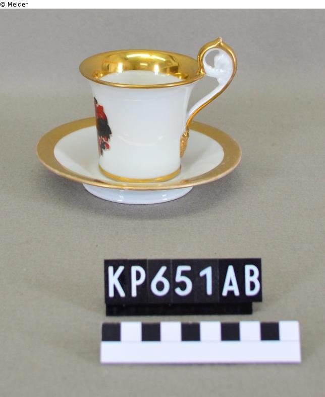 Tasse mit Wappenschild und Untertasse aus Porzellan: Tasse KP00651A: konische Form mit sich weit öffnender Mündung; randständiger Überhenkel in Ohrenform, Abschnitt oberhalb des Rand volutenartig eingerollt; Standring an der Wandung durch Wulst angedeutet; Randlippe, Mündungsbereich im Inneren, Außenseite Henkel und Wulst am Bodenumbruch vergoldet; auf der dem Henkel gegenüberliegenden Seite Darstellung eines roten Wappenschildes mit drei grauen Signalhörnern, darüber Visierhelm mit nach links gerichtetem grauen Ziegenbock als Helmzier und grauen und roten Helmdecken; Ziffer "63." als Ritzmarke im Boden. Untertasse KP00651B: Standring wulstartig; Wandung ohne erkennbaren Absatz in Fahne übergehend; waagerechte Randlippe mit breitem Goldband; auf dem Spiegel fünfzeilige Widmung "L. v. Gaudecker / s/m / O. v. Düring / 18 A. 49. / Nr! (?)"; Ziffer "63." als Pressmarke im Boden.