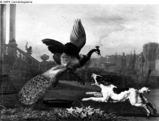 Suchmeldung Hund einen Pfau angreifend Hersteller/Künstler:in Hondius, Abraham Objektart Gemälde Material / TechnikHolz / gemaltLost Art-ID257702