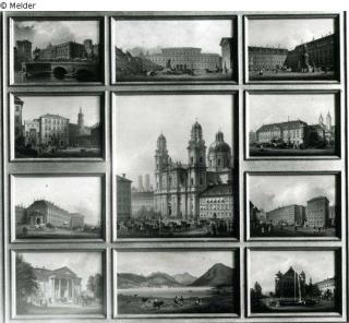 Suchmeldung Neunteiliges Tableau mit Ansichten der Theatinerkirche in München, des Tegernsees und Schloßbauten Hersteller/Künstler:in Quaglio, Domenico Objektart Malerei Material / TechnikÖl ; Leinwand / gemaltLost Art-ID41171