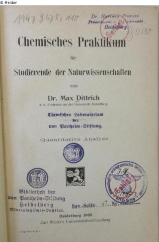 Fundmeldung Chemisches Praktikum für Studierende der Naturwissenschaften [2]. Quantitative Analyse Autor:in Dittrich, Max Verlag Winter Objektart Buch Lost Art-ID586079