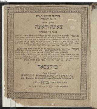 Fundmeldung Tseʾenah u-reʾenah: Ḥamishah ḥumshe Torah megilot ṿe-hafṭarot bi-leshon ashkenaz Herausgeber Madpis, Zeḳl ben Aharon Verlag Zeḳl ben Aharon Objektart Buch Lost Art-ID612427