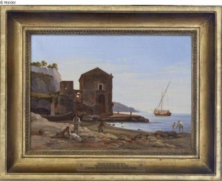 Fundmeldung Sorrent, Marina Piccola alternative Titel: Südliche Küstenlandschaft; Fischer am südlichen Strand Hersteller/Künstler:in Reinhold, Heinrich Objektart Gemälde Material / TechnikÖl ; Leinwand / gemaltLost Art-ID606614