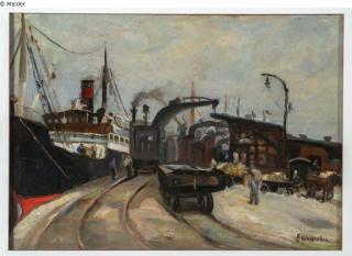 Fundmeldung Dampfer beim Löschen im Baltischen Hafen Hersteller/Künstler:in Wulfsohn, Benno Objektart Gemälde Material / TechnikÖl ; Pappe / gemaltLost Art-ID616312