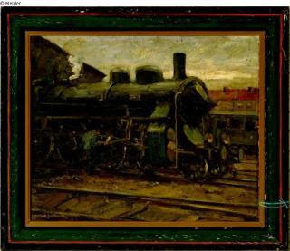 Fundmeldung Vor dem Lokomotivschuppen / Eine Dampflok wird geschmiert / Lokomotive Hersteller/Künstler:in Sandrock, Leonhard Objektart Gemälde Material / TechnikÖl ; Karton / gemaltLost Art-ID616313