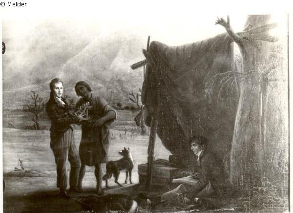 Alexander von Humboldt und der Botaniker Aimé Bonpland unterhalb des Chimaborazo (Kordilleren in der Republik Ecuador an der Südwestküste von Amerika), den die beiden Forscher am 23 Juni 1804 vom Dorfe Calpi aus bestiegen, in stark vertieften Goldrahmen, der Innen eine schmale Akanthusborte zeigt, Breite: circ. 11 cm, Neuerwerbungen des Märkischen Museum IX, S. 6, Abb. 2 (Teilansicht)