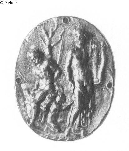 Ovale Plakette, oben und an den beiden Seiten Durchbohrungen. Links sitzt der an einen kahlen Baum gefesselte Marsyas, rechts steht Apoll mit der Kithara im Arm. Zwischen ihnen kniet Marsyas' Schüler Olympos und fleht den Gott um Erbarmen an. Die Plakette wurde dem berühmten antiken Karneol des Dioskurides nachgebildet, der früher im Besitz des Lorenzo de' Medici war und sich jetzt im Museo Nazionale von Neapel befindet (Gori I, 66, 9 / Mariette I, Nr. 13 = Reinach 1895, Tafeln 32/84; Furtwängler 1900, Tafel XLII, Nr. 28). Der Stein wurde in der Renaissance oft kopiert, sowohl auf Gemmen (u. a. in der Bibliothèque Nationale in Paris und in der Ermitage in St. Petersburg) als auch auf Plaketten (Ricci hat acht verschiedene Typen angeführt). Er wurde um 1428 von Ghiberti mit einer (heute verlorenen) Goldfassung samt einer Inschrift versehen, die auch in einigen Plaketten überkommen ist. Ein Marmorrelief mit der Szene, das als eine Jugendarbeit Michelangelos angesehen wurde, war früher als Leihgabe in der Alten Pinakothek in München (Wilhelm Bode, Eine Marmorkopie Michelangelo's nach dem antiken Cameo mit Apoll und Marsyas, in: JKPKS 12, 1891, S. 167-170; Hans Mackowsky, Apollo und Marsyas, Michelangelos frühstes Werk, Leipzig 1929), heute befindet es sich in Washington. Die Szene erscheint auch auf der Rückseite der Medaille auf Nikolaus Schlifer des Boldù von 1457 (Hill 1930, Nr. 418), auf der Rückseite einer Gemme mit dem Bildnis Papst Pauls II. von 1468 im Museo Correr in Venedig und auf einem Medaillon der Porta Stanga (um 1496) im Louvre in Paris.