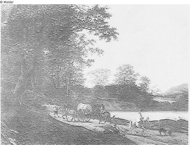 Auf einem Waldweg Bauernkarren und Reiter in rotem Rock, rechts ein See