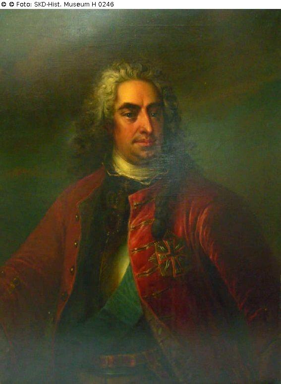 Gemälde August der Starke; Der Dargestellte wird beschrieben: „Roter Rock, darunter Küraß und blaues Ordensband, Ordensstern, weißes Halstuch.“