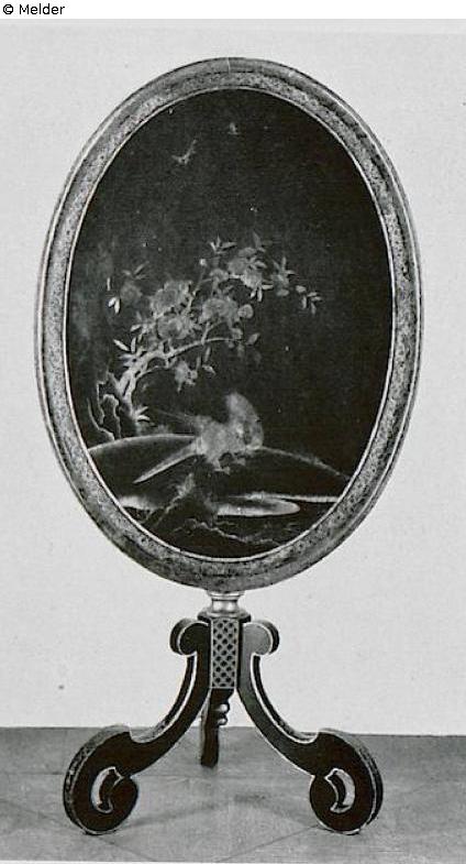 mit Lackmalerei in Schwarz und Gold. Ovale Platte mit Blütenstrauch und Fasanenpaar nach japanischem Vorbild und Laubwerkkante. Der auf drei Voluten ruhende Balusterfuß mit Laub- und Bandelwerkornamenten verziert. Dresden, um 1715. Arbeit des Hoflackierers Martin Schnell (1675–1740). Literatur: Auktionskatalog Hans W. Lange, Wertvolles Kunstgewerbe, Berlin, 19.-21. Mai 1941, S. 20-21. Nr. 60 (DOI: Externer Link)