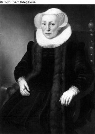 Tafelmalerei: Bild: Bürger(liche); Bürger(liche); Bez. links über Stuhllehne: AE (verbunden) tatis. 68/ Anno, 1624/JG (verbunden) cuyp.fecit; Signatur: siehe 'Beschreibung'; Maße: 106 x 76 cm