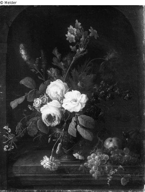 Blumenvase und Früchte in einer Mauernische