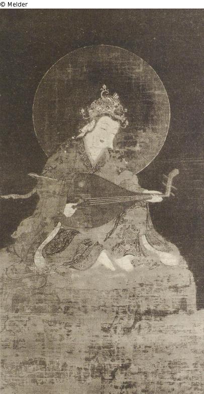 Die Göttin Benten (Sarasvati), die Gattin Brahmas, ist in reicher fürstlicher Tracht gekleidet. Sie sitzt auf einem Felsen und spielt die Biwa (Kurzhalslaute). Gerahmt