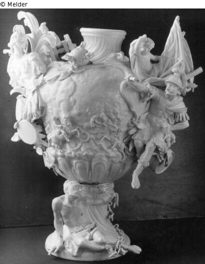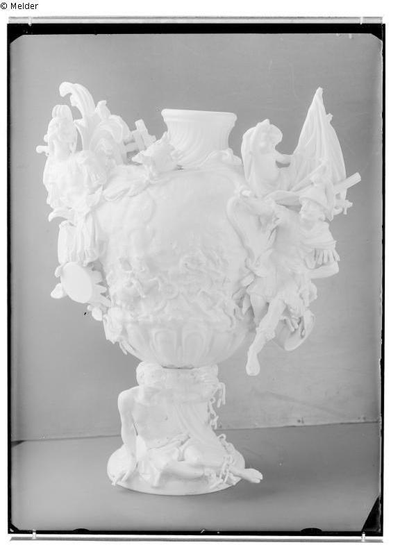 "84. Unterteil einer weißen Ziervase mit Kriegsgott und kriegerischen Emblemen, auf der Schulter 1 Geschütz, Meißner Porzellan, aus 2 Stücken zusammengeschraubt, große Schwerter, Joh. Marke: no. 423, III 489. Höhe: 47 c, Breite: ca. 35 cm. (Turmzimmer, vormal. Residenzschloß Dresden)."