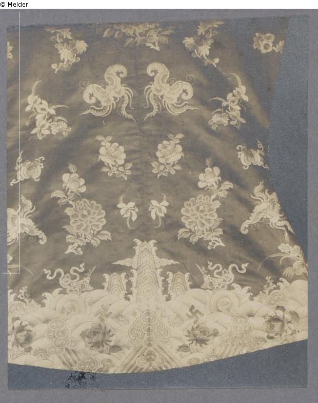 Aus dunkelblauer Seide. Darauf sind Päonien und Schmetterlinge in blau und weißer Seidenstickerei zu sehen. Die Abschließkante ist wellenartig mit Päonien.