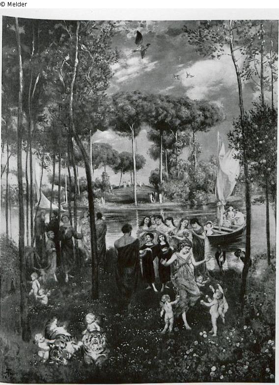 Arkadische Wiesenlandschaft mit Flußlauf, in der sich junge, antikisch gewandte Menschen musizierend unter hohen Pinienbäumen ergehen. Tiefblauer Wolkenhimmel. signiert l. u.: H. Th. 1879