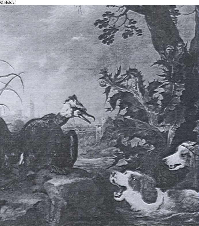 Im linken Vordergrund sitzt auf einem gelben Stein der große schwarze Vogel und wehrt mit schlagenden Flügeln und geöffnetem Schnabel zwei angreifende gelbweiße Hühnerhunde, die mit geöffnetem Rachen durch ein Wasser heranwaten und nur zu einem Drittel sichtbar sind. Hinter diesen ein großer Distelbusch und ein Baumstamm, der vom oberen Bildrand überschnitten wird. Der Hintergrund wird von einem Wasser, einer Stadtansicht und einem hellgrauen Himmel mit einigen Sonnendurchblicken gebildet.