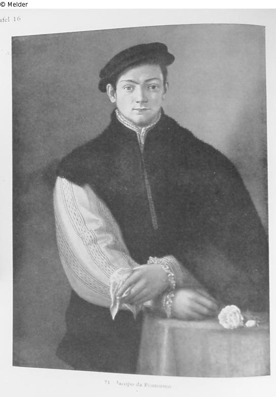 Der in Kniefigur Dargestellte ist von vorn gesehen und blickt den Beschauer an. Weißer Untergewand mit schwarzem Obergewand und schwarzem Barett. Die Rechte, in der er Rosen hält, ist auf einen Tisch mit grüner Decke gelegt, während er in der Linken ein weißes Tuch hält. Heller blaugrauer Grund. Goldener Rahmen. Gutachten: Bodo ("...echtes, besonders tüchtiges Werk...aus seiner späteren Zeit um 1540/45...sehr gut erhalten..."). 14.11.1928.