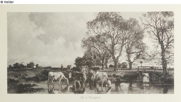 Kuhherde, verschiedenfarbig. Auf der Weide, teils im Wasser; eine Bäuerin folgt der Herde. Auf einer Landstraße alte Eichen, über einen Kanal führt eine Brücke; bedeckter Himmel. Goldrahmen